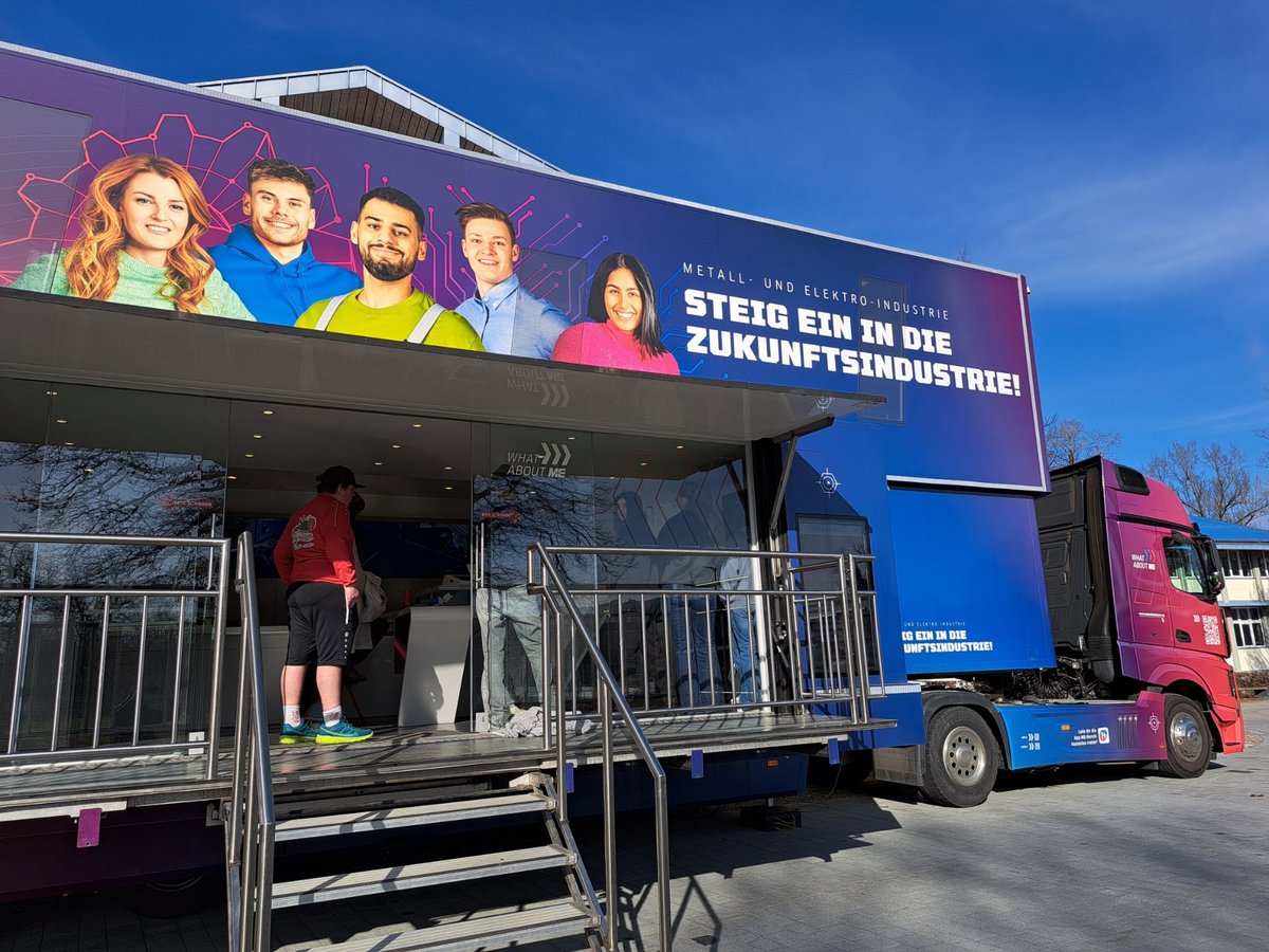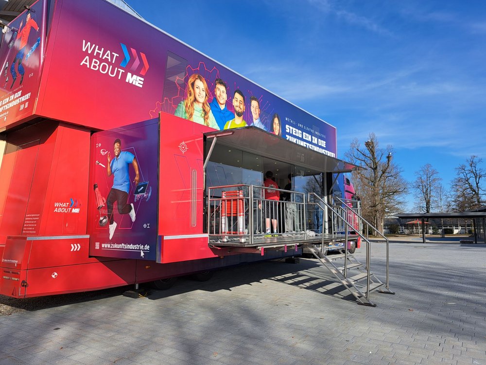 In den vergangenen Tagen staunten die Schülerinnen und Schüler der Verbundschule am Rotmoos nicht schlecht: Ein echtes Schwergewicht der Berufsorientierung parkte direkt vor unserer Tür. Der M+E-Truck – das mobile Informationszentrum der Metall- und Elektroindustrie – machte Station in Isny, um die Welt der Technik direkt auf den Pausenhof zu bringen.
